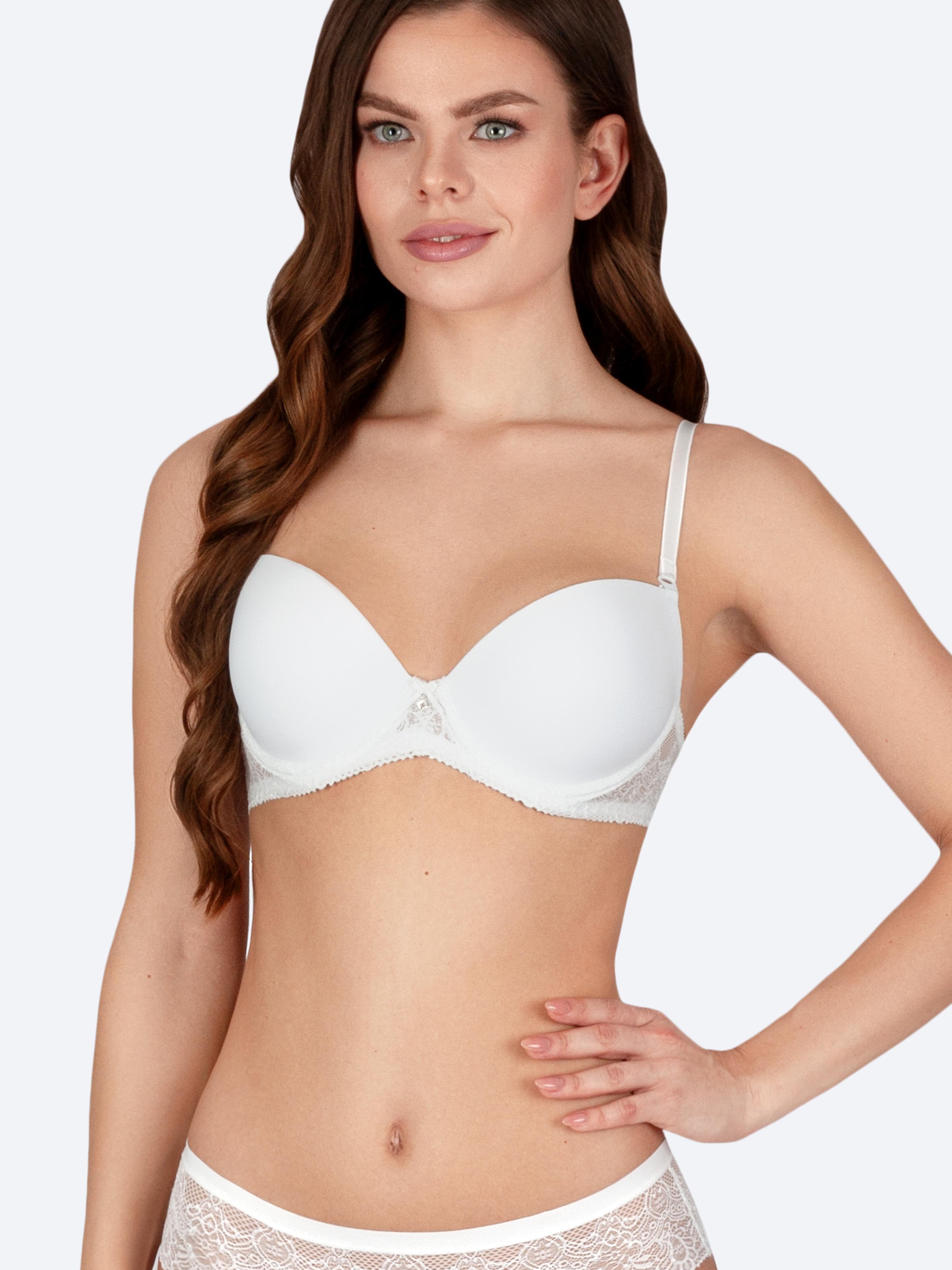 Бюстгальтер Push-up на каркасах. Стан бюстгальтера изготовлен из широкого эластичного кружева. Формованные чашки пуш-ап выполнены: лицевая сторона чашечек - из гладкого эластичного микроволокна (микрофибры), изнаночная сторона чашек - из хлопка. Изнаночная сторона тесьмы и бретелей бюстгалтера очень мягкая и приятная к телу. Съемные бретели регулируются по длине. У бюстгальтера в качестве декоративного элемента присутствует маленький бантик с украшением со стразами спереди по центру изделия. Бюстгальтер женский пушап кружевной подходит практически к любой форме груди. Эта форма нижнего белья позволяет создать визуальное увеличение груди, придает груди наполненность и создает объемное декольте. Лифчик женский пуш ап имеет мягкие формованные чашки с дополнительной набивкой в их нижней части. Лиф пушап представлен с чашечками на косточках, которые усиливают поддержку, приподнимая грудь, делая ее более полной и округлой. Удобный и красивый бюстгальтер пуш ап с кружевом подходит для повседневной носки, для торжественных случаев, как свадебное белье, бюстгальтер для подростка, бюстгальтер для маленькой груди. Белье подходит как для офисного стиля, так и для вечернего образа.