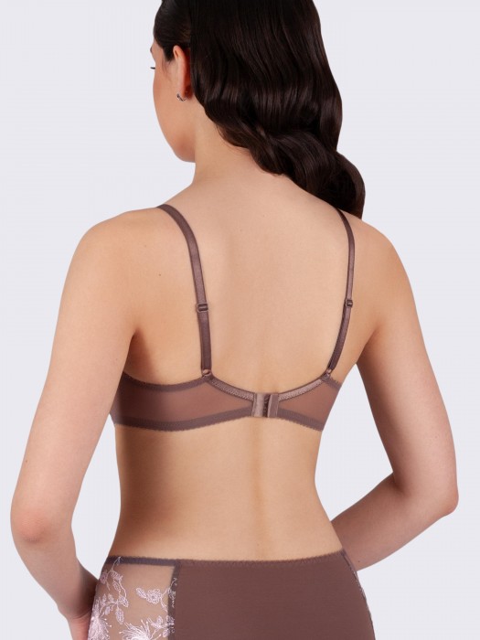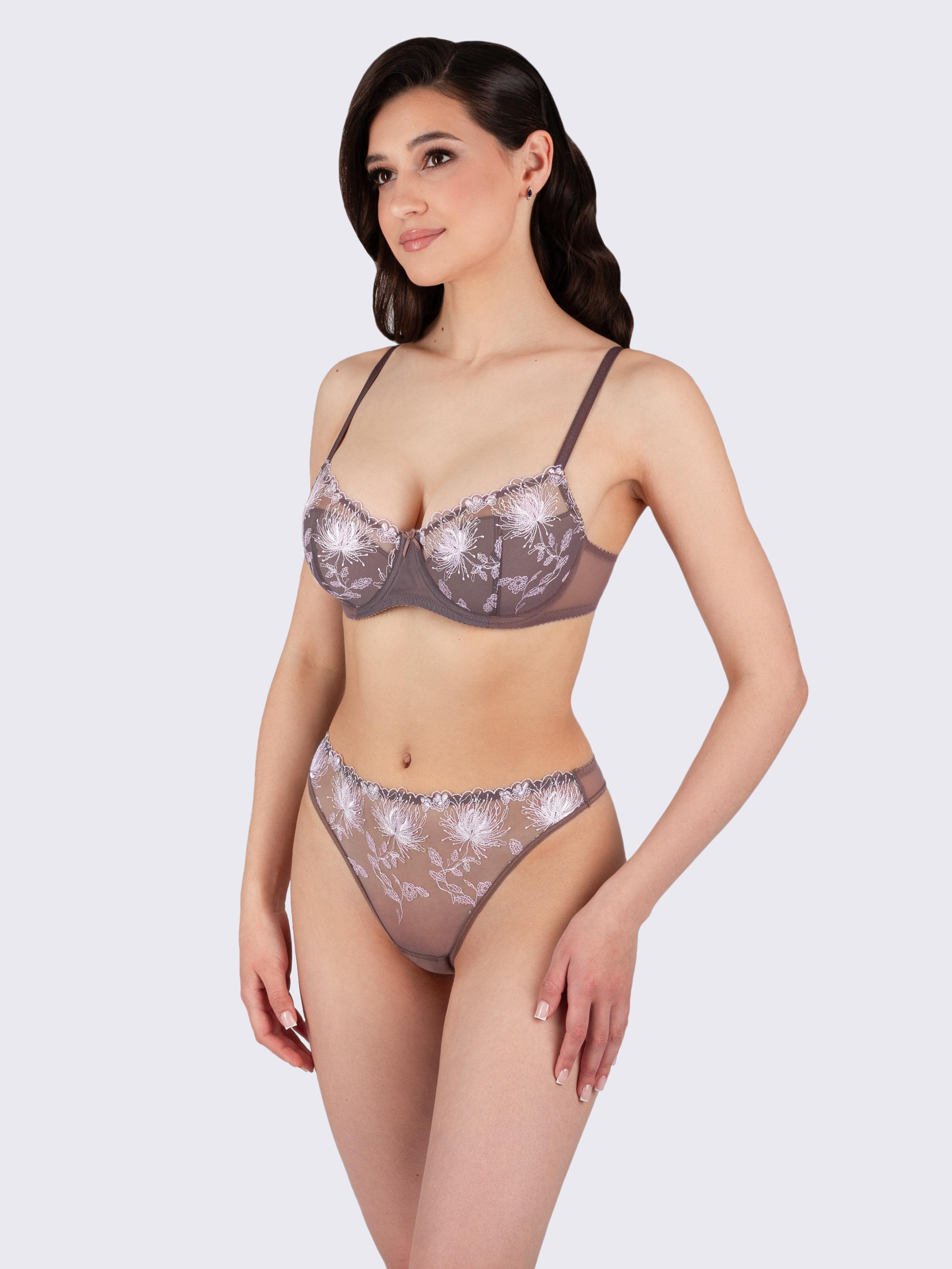 Бюстгальтер с дублированной чашкой на каркасах изготовлен из полупрозрачной сетки с изысканной цветочной вышивкой. Чашки выполнены из сетки с вышивкой, пояс бюстгальтера из однотонной эластичной мягкой сетки. Внутри чашки имеется уплотнитель из поролона с хлопковой изнанкой, который по верхнему срезу оформлен плавной фигурной линией, что придает груди утонченность. Каркасы оказывают хорошую поддержку груди, делая ее более полной и округлой. Изнаночная сторона тесьмы и бретелей бюстгальтера мягкая и приятная к телу. Бретели регулируются по длине. Ширина бретели зависит от размера бюстгальтера, чем больше размер и полнота, тем шире бретель. Удобный, дышащий, сексуальный и красивый мягкий бюстгальтер подходит для повседневной носки, для торжественных случаев, как свадебное белье. Белье подходит как для офисного стиля, так и для вечернего образа.