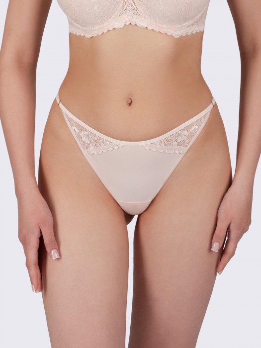 Трусы стринги изготовлены из гладкого приятного полотна микрофибра и эластичного мягкого кружева. Трусики имеют среднюю линию талии и создают утонченный силуэт. Подкладка ластовицы из натурального хлопка. По линии талии мягкая эластичная тесьма с регулировкой по бокам, что позволит подобрать размер индивидуально под фигуру. Узкие эластичные ленты по линии бедер настрочены незаметным плоским швом, чтобы трусики не выделялись под одеждой. Посадка в меру откровенная, выделяет линию бедер. Изделие не боится многократных стирок. Со временем белье не меняет цвет и не растягивается.