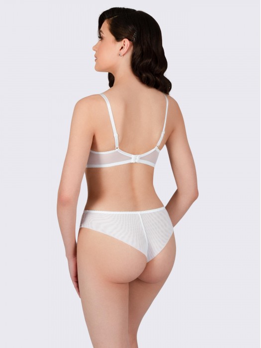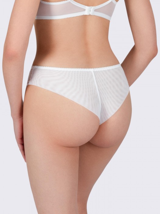 Трусы бразильяно со средней линией талии, средняя посадка обеспечивает идеальную фиксацию без передавливания, подчеркивая естественные линии фигуры. Полупрозрачная модель привлекает внимание изысканным дизайном: передняя деталь трусиков выполнена из сетки с цветочной вышивкой, а задняя из двойной эластичной сетки. Перегиб сетки по линии бедра, мягко огибает ягодицы, что исключает натирание кожи и делает трусики незаметными под одеждой. Ластовица выполнена из натурального хлопка с лайкрой, что обеспечивает дополнительный комфорт. По линии талии идет мягкая эластичная тесьма. Выверенные классические конструкции трусов бразильяно подчеркивают изящество фигуры и создают комфорт. Изделие не боится многократных стирок. Со временем белье не меняет цвет и не растягивается. Трусики с вышивкой бразильяно очень удобные в повседневной носке, а также их можно использовать для спорта, бега, йоги, танцев, фитнеса, гимнастики, для торжественных случаев, как свадебное белье.
